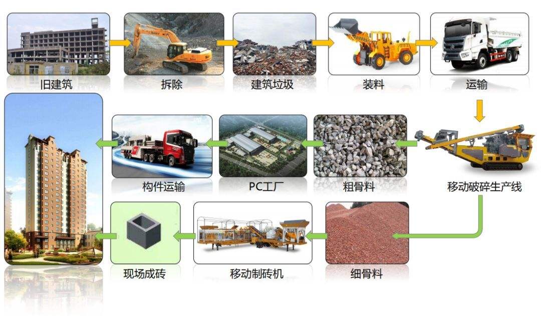 1、建筑垃圾破碎→粉碎→ 磁选(可用移动式建筑垃圾破碎站一站式解决)